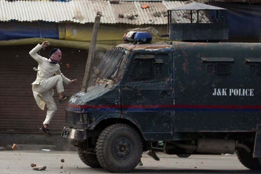 Read moreA masked Kashmiri protester jumps on the hood of an armored Indian police vehicle as he throws stones at it during a protest in Srinagar, Indian-controlled Kashmir, on May 31, 2019. #