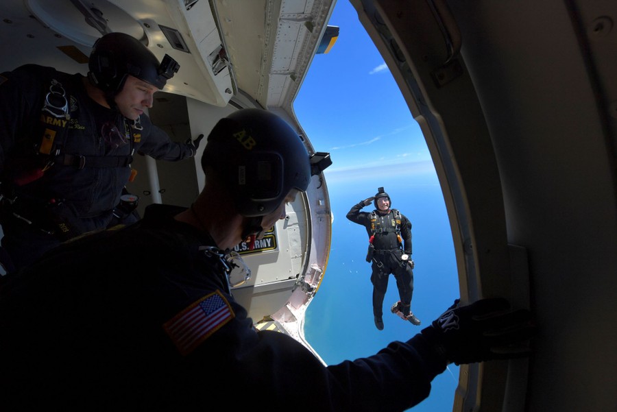 Read moreMembers of the U.S. Army's Golden Knights parachute team perform during the Bethpage Air Show as part of a Memorial Day event at Jones Beach on Long Island, New York, on May 25, 2019. #