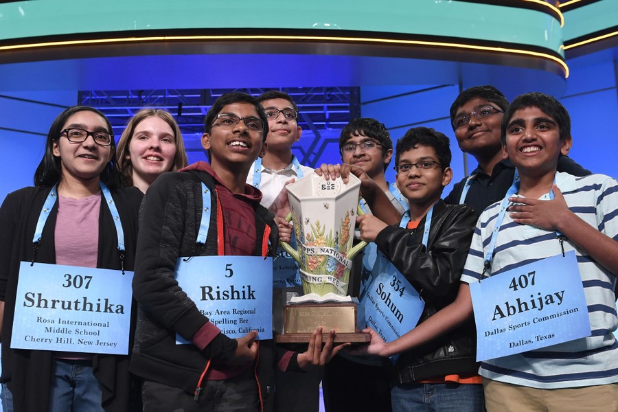 Read moreThe eight co-champions of the 2019 Scripps National Spelling Bee, (from left) Shruthika Padhy, 13, of Cherry Hill, New Jersey; Erin Howard, 14, of Huntsville, Alabama; Rishik Gandhasri, 13, of San Jose, California; Christopher Serrao, 13, of Whitehouse Station, New Jersey; Saketh Sundar, 13, of Clarksville, Maryland; Sohum Sukhatankar, 13, of Dallas, Texas; Rohan Raja, 13, of Irving, Texas; and Abhijay Kodali, 12, of Flower Mound, Texas, hold the trophy in Oxon Hill, Maryland, on May 31, 2019. #
