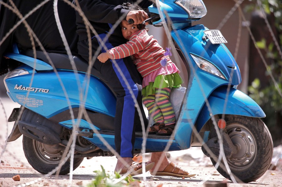 Read moreA girl holds on to a man on a scooter as they wait to cross concertina wire laid on a road in Srinagar by Indian police during a strike called by Kashmiri separatists against the killing of Zakir Rashid Bhat, also known as Zakir Musa, the leader of an al-Qaeda–affiliated militant group in Kashmir, on May 25, 2019. #
