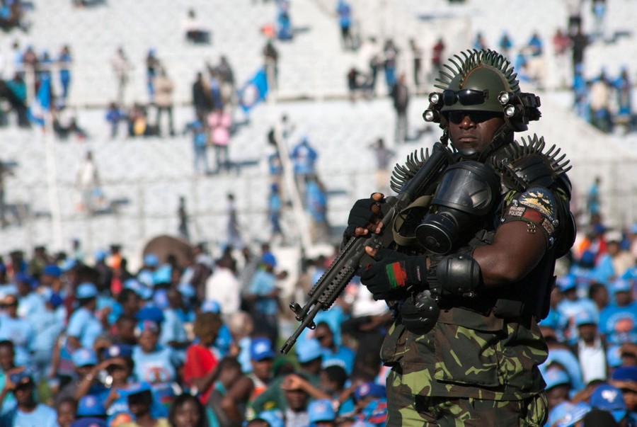 Read moreA security guard with unusual body armor, featuring curved spikes, four head-mounted flashlights, two pairs of sunglasses, and a ready gas mask, keeps watch during the swearing-in ceremony of Malawian President-elect Arthur Peter Mutharika at Kamuzu Stadium in Blantyre, Malawi, on May 28, 2019, after a contentious election marred by allegations of fraud and vote-rigging. #
