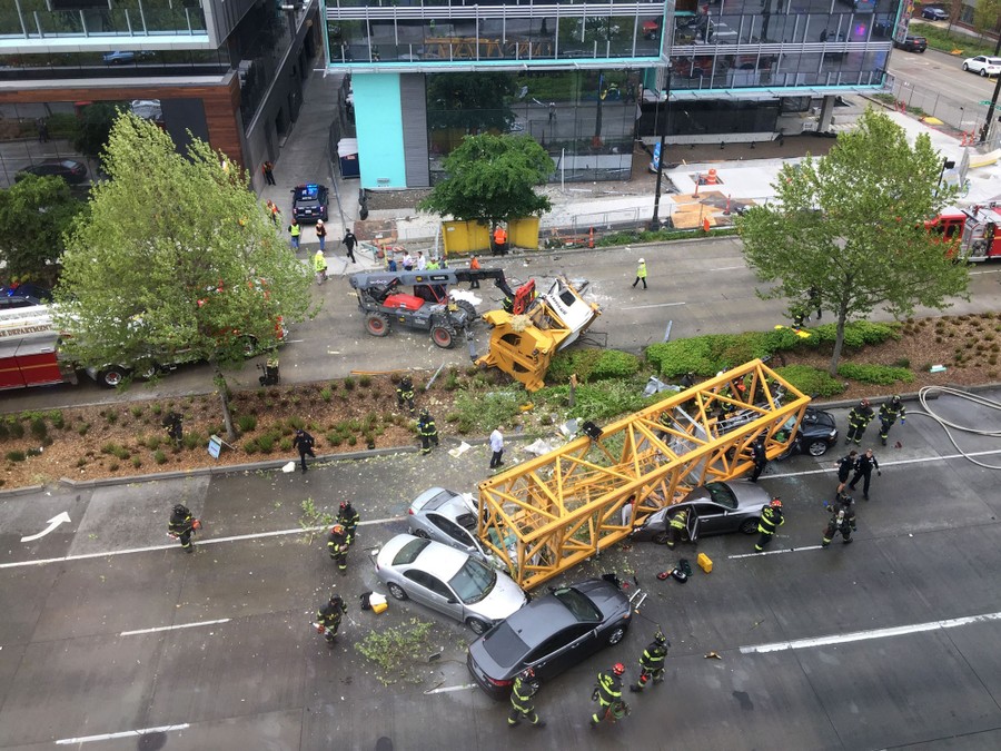 Read moreFire and police crew members work to clear the scene where a construction crane fell from a building on Google's new Seattle campus, crashing down onto one of the city's busiest streets and killing multiple people on April 27, 2019. #
