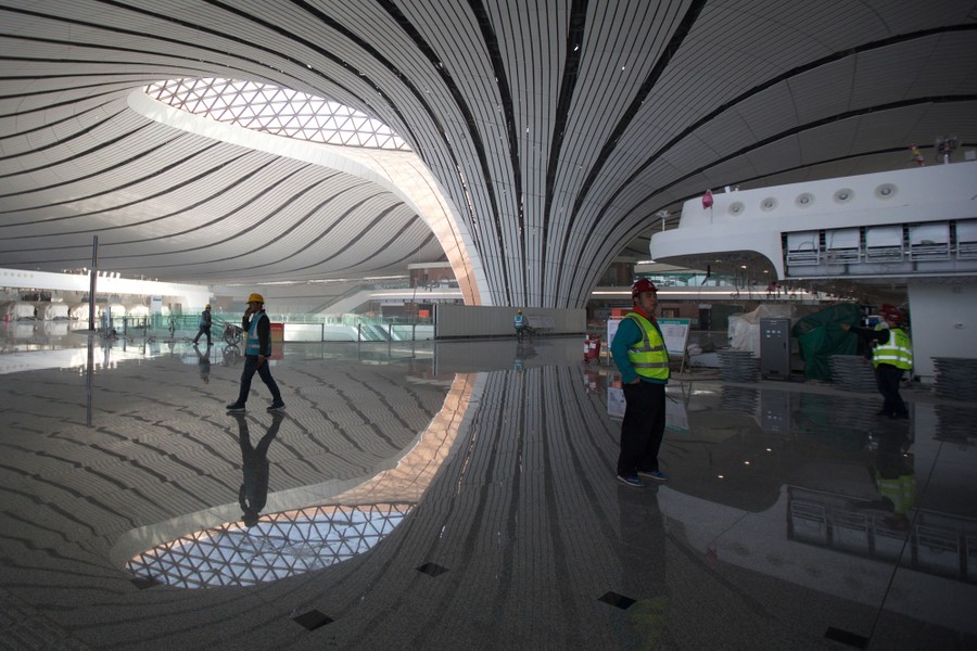 Read moreConstruction workers are seen inside the terminal hall of the Beijing Daxing International Airport under construction, in Daxing district, Beijing, China, on April 25, 2019. #