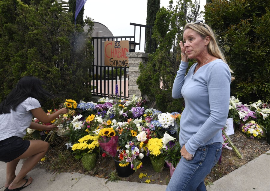 Read moreChristy Wilkenson wipes a tear from her eye after putting flowers on a memorial at the Chabad of Poway synagogue on April 28, 2019, in Poway, California. A man opened fire Saturday inside the synagogue, near San Diego, as worshippers celebrated the last day of a major Jewish holiday. #
