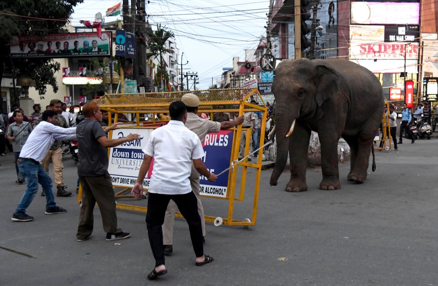 Read moreCivilians along with forest and police personnel try to chase away a wild male elephant on the GS road in Guwahati, India, on April 30, 2019. The elephant caused a major stir in the city, wandering along busy streets and among crowds of photo-snapping onlookers before being tranquilized, officials said. #