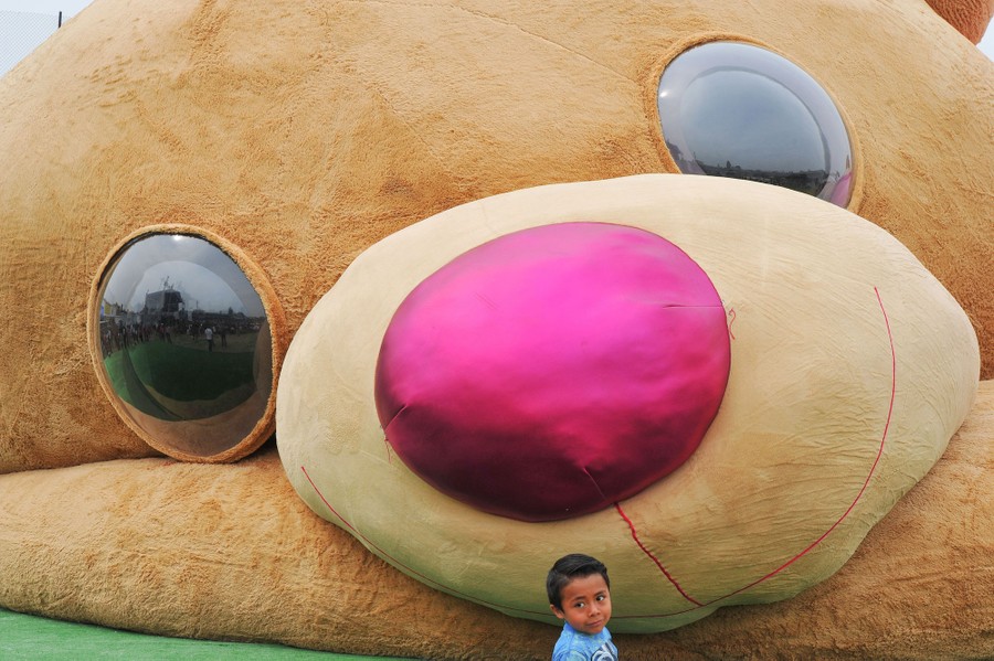 Read moreA little boy stands in front of a giant teddy bear measuring more than 20 meters long and weighing four tons, which entered the Guinness Book of World Records as the biggest of its kind, on April 28, 2019, in Xonacatlan, Mexico. #