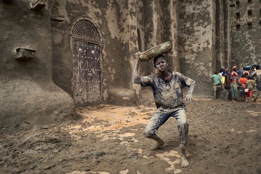 Read moreA man takes part in the annual rendering of the Great Mosque of Djenne in central Mali on April 28, 2019. Several thousand residents of the historic central Malian city of Djenne took part in the annual rendering ceremony of the Grand Mosque, which will now be powered by solar electricity. The rendering of the building with banco (a mixture of soil and water, with rice bran, shea butter, and baobab powder), made by the city's inhabitants, helps to protect the mosque from bad weather ahead of the rainy season. #