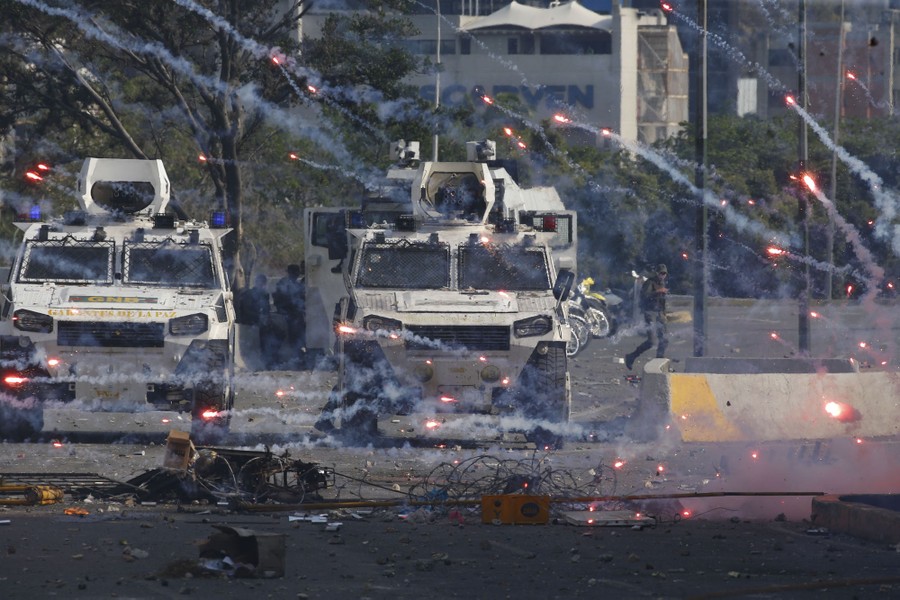 Read moreFireworks launched by opponents of Venezuela's President Nicolás Maduro land near Bolivarian National Guard of Venezuela armored vehicles loyal to Maduro, during an attempted military uprising in Caracas on April 30, 2019. #