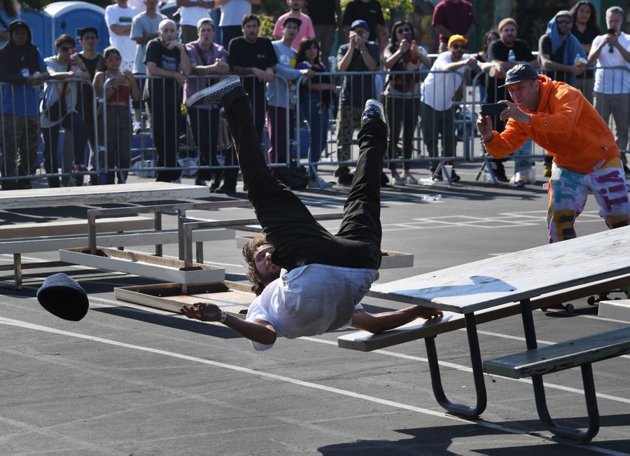 Read moreA skateboarder wipes out as he competes during the Daewon's Picnic invitational skating competition at Lockwood Elementary School, Los Angeles's historic picnic-table skate spot, on May 12, 2019. The competition was held to honor the legendary career of the skater Daewon Song. #