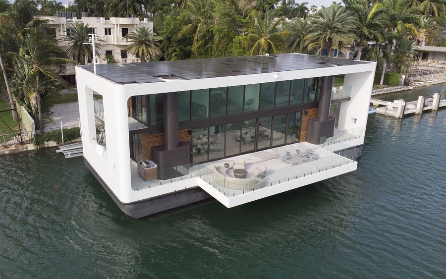 Read moreAn aerial view shows the Arkup houseboat, a green-energy luxury floating home that can allow owners to adapt as the sea level continues to rise, in Miami Beach, Florida, on May 14, 2019. The Arkup, built by the founders Arnaud Luguet and Nicolas Derouin, is a fully solar-powered and sustainable luxury, livable yacht that has four hydraulic pilings that stabilize the vessel on the seafloor and that can also be used to lift the living quarters above rising ocean waters. #