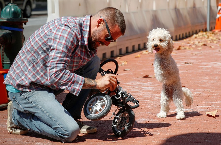 Read moreThe double-amputee dog Cora Rose balances on her hind legs to watch Zach Skow repair her cart on a street in Washington, D.C., on May 15, 2019. Cora Rose serves in a California prisoner-therapy program founded by Skow called Pawsitive Change. #