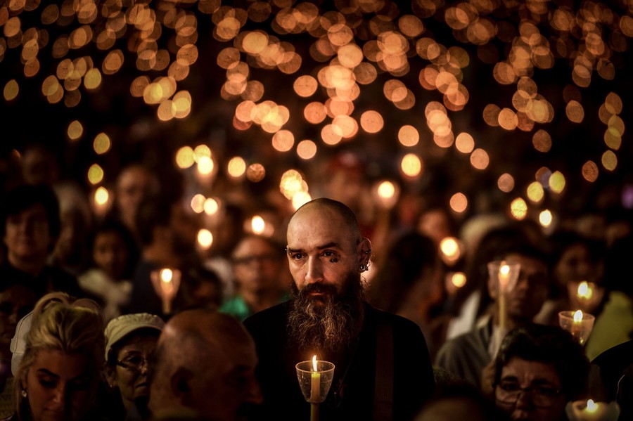 Read moreA man holds a candle as he prays with thousands of others during a candle procession at the Fatima Shrine in Fatima, central Portugal, on May 12, 2019. Thousands of pilgrims converged on the Fatima Sanctuary to celebrate the anniversary of Fatima's miracle, when three shepherd children claimed to have seen the Virgin Mary in May 1917. #