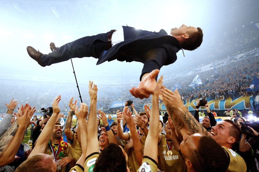 Read moreFC Zenit St. Petersburg players throw their head coach, Sergei Semak, in the air as they celebrate their championship victory after the Russian Premier League match between FC Zenit St. Petersburg and PFC CSKA Moscow in St. Petersburg, Russia, on May 12, 2019. #