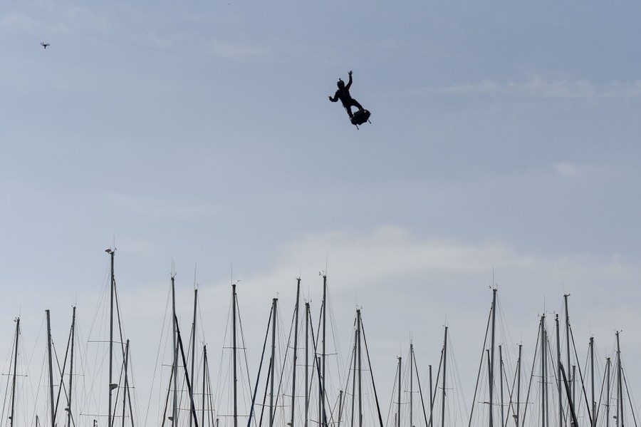 Read moreThe French pilot and performer Franky Zapata flies on a flyboard above the new multihull Sodebo Ultim 3 during its baptism ceremony in Les Sables-d'Olonne, France, on May 19, 2019. #