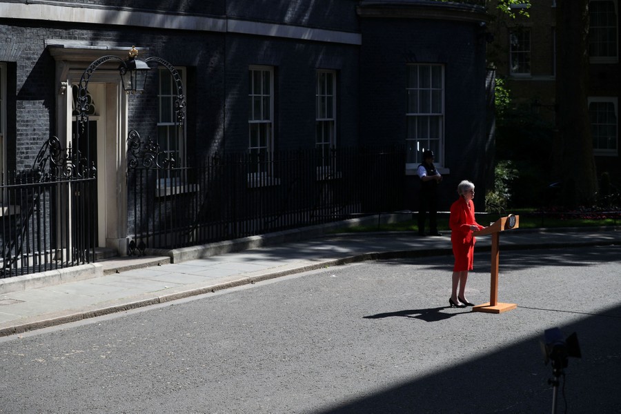 Read moreBritish Prime Minister Theresa May stands before a podium at Downing Street in London, England, on May 24, 2019. May announced that she would be stepping down as Britain's prime minister. #