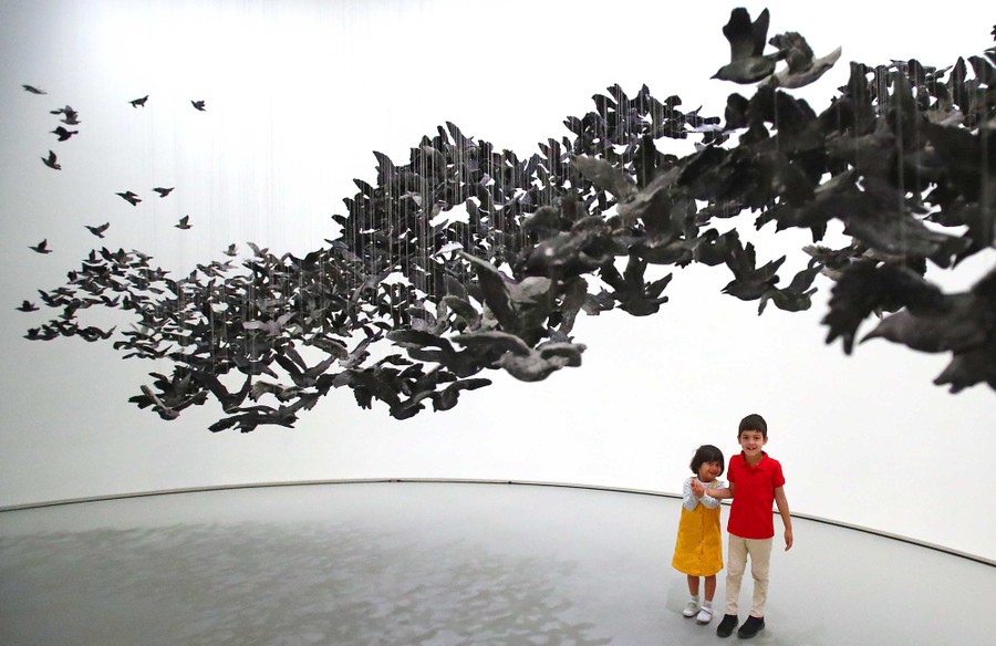 Read moreChildren look at the installation Murmuration (Landscape), an enormous flock of 10,000 porcelain starlings swarming overhead, by the Chinese artist Cai Guo-Qiang, at the National Gallery of Victoria in Melbourne, Australia, on May 23, 2019. #