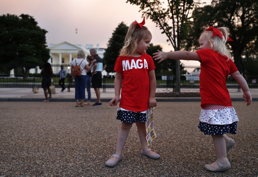 Read moreWearing MAGA shirts, the sisters Pepper (left) and Daisy, from southwestern Virginia, play together at sunset as they visit the White House with their mother on May 18, 2019. #