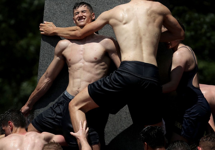 Read moreThe 2022 midshipmen's class from the U.S. Naval Academy works to scale the Herndon Monument and place an upperclassman’s hat atop the monument in an annual tradition in Annapolis, Maryland, on May 20, 2019. Plebes, or freshmen, must scale the monument, greased with about 50 pounds of vegetable shortening, using teamwork to remove a traditional plebe cap and replace it with the upperclassman’s cap. The tradition dates back more than 70 years and concludes the plebe year for Naval Academy students. #