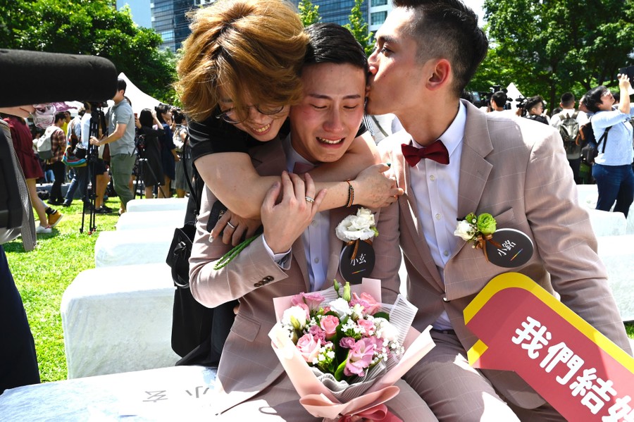 Read moreShane Lin (center) is comforted by his partner, Marc Yuan (right), and a friend during a wedding ceremony in the Shinyi district of Taipei, Taiwan, on May 24, 2019. A new law had just gone into effect making Taiwan the first country in Asia to legalize same-sex marriage and granting couples full, legal marriage rights. #