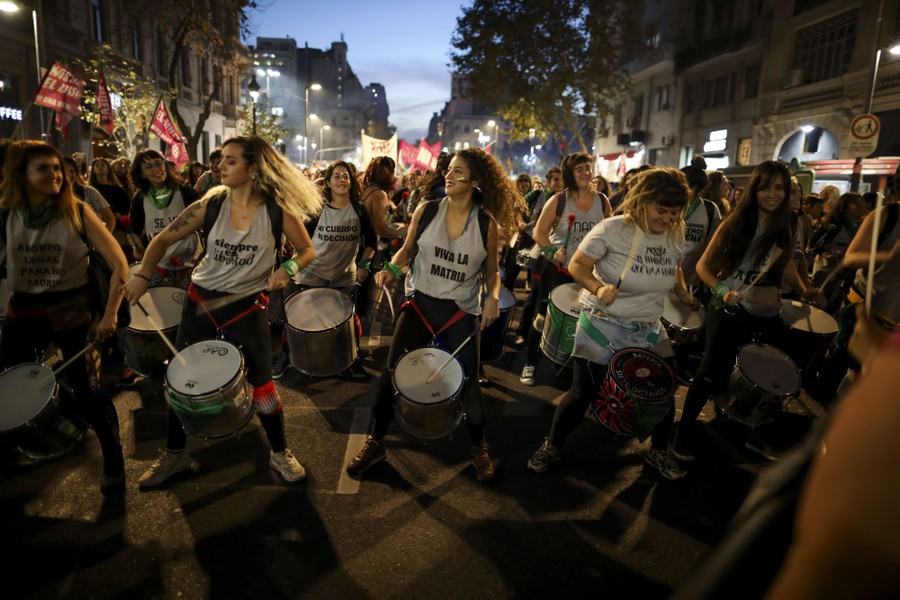 Read moreWomen play drums during a protest against gender violence in Buenos Aires, Argentina, on June 3, 2019. The grassroots movement "Ni una menos," or Not One Less, is marking its fourth anniversary by remembering the hundreds of women who have been murdered since its founding, and demanding laws to curb the sexist violence that continues to permeate Argentine society. #