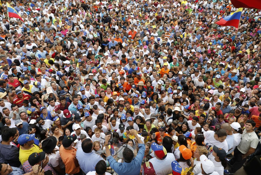 Read moreJuan Guaidó, Venezuela's opposition leader and self-proclaimed interim president (wearing a blue shirt at the bottom center of the photo), speaks to supporters during a visit to Socopo in Barinas state, Venezuela, on June 1, 2019. Guaidó took his campaign to oust President Nicolás Maduro to the birthplace of Hugo Chavez, the socialist leader's mentor. #