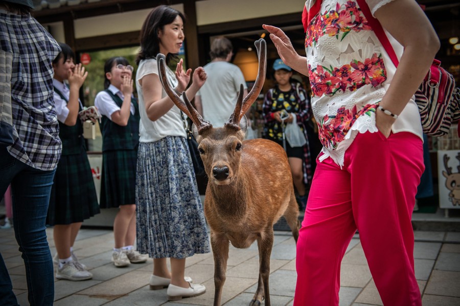 Read moreA tourist raises her hand above the antlers of a wild sika deer as it walks through a crowd in Nara, Japan, on June 6, 2019. Nara's free-roaming deer have become a huge attraction for tourists. However, an autopsy on a deer that was recently found dead near one of the city's famous temples revealed 3.2kg of plastic in its stomach and caused concern about the effect of tourism as Japan struggles to cope with a huge increase in domestic and international tourists. #