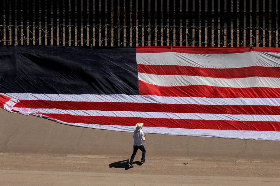 Read moreRoberto Márquez, a Mexican U.S. resident, places a United States flag on the border wall next to the Rio Grande to demonstrate against the immigration policies of Donald Trump on the border between El Paso, Texas, and Ciudad Juarez, Mexico, on June 6, 2019. #