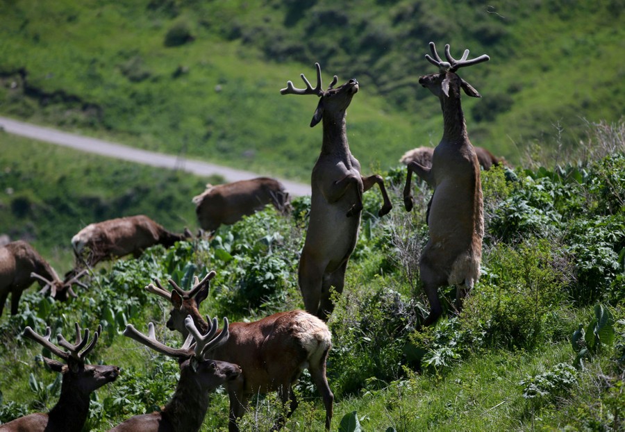Read moreDeer graze on Alatau Maraly farm in Kasymbek gorge, in Kazakhstan's Almaty region, on May 31, 2019. Maral stags at this private farm undergo an annual cutting of their antlers to be sold to pharmaceutical companies. #
