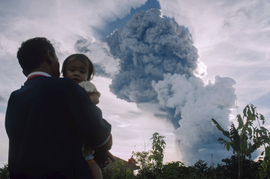 Read moreA man carries a child while he watches Mount Sinabung spewing volcanic materials into the air during an eruption, in Kabanjahe, North Sumatra, Indonesia, on June 9, 2019. #