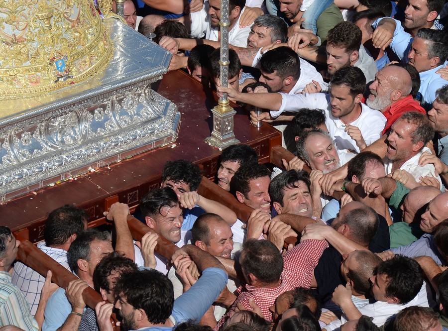 Read moreThe effigy of the Rocio Virgin is carried on shoulders as pilgrims gather around it during a procession in the village of El Rocio on June 10, 2019. The El Rocio pilgrimage, the largest in Spain, gathers hundreds of thousands of devotees in traditional outfits converging in a burst of color as they make their way on horseback and aboard decorated carriages across the Andalusian countryside. #