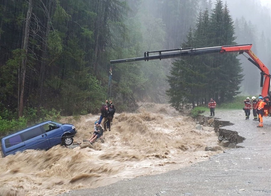Read moreTwo occupants of a stranded van are lifted, unhurt, by a crane during heavy rain in this picture released on June 12, 2019, by the Graubuenden police in Spluegen, Switzerland. #