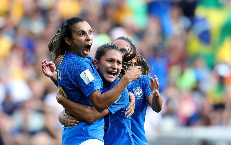 Read moreMarta of Brazil celebrates with teammates after scoring her team's first goal during the 2019 FIFA Women's World Cup France Group C match between Australia and Brazil at Stade de la Mosson in Montpellier, France, on June 13, 2019. #