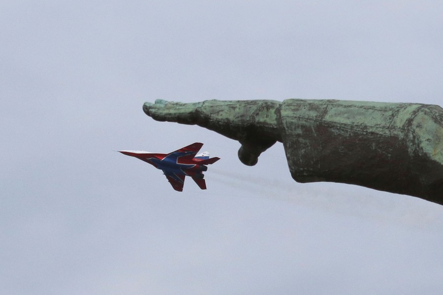 Read moreA MiG-29 jet fighter of the Strizhi (Swifts) aerobatic team performs during a rehearsal for an air show, part of the Russian all-army competition Aviadarts-2019, with a portion of the Monument to Soldier and Sailor seen in the foreground, in the Black Sea port of Sevastopol, Crimea, on June 7, 2019. #