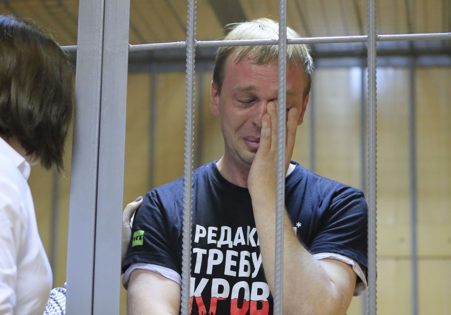 Read moreA lawyer comforts the Russian investigative journalist Ivan Golunov, who was detained by police and accused of drug offenses, during a court hearing in Moscow, Russia, on June 8, 2019. The writing on the T-shirt reads "Editorial desk demands blood." #