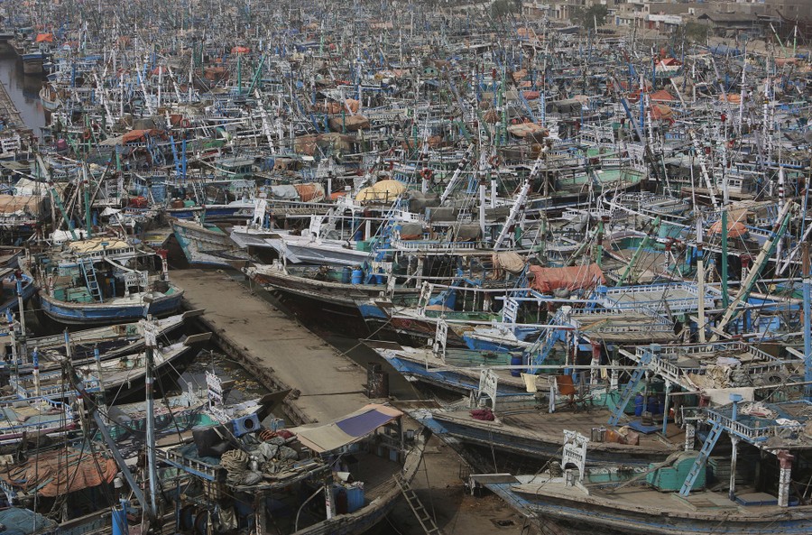 Read morePakistani fishing boats are called back from the sea following a warning by authorities of Cyclone Vayu in the Karachi harbor in Pakistan, on June 13, 2019. The meteorological department issued an alert, warning fishermen to avoid fishing in the Arabian Sea this week, as Cyclone Vayu could cause rough conditions in the sea. #