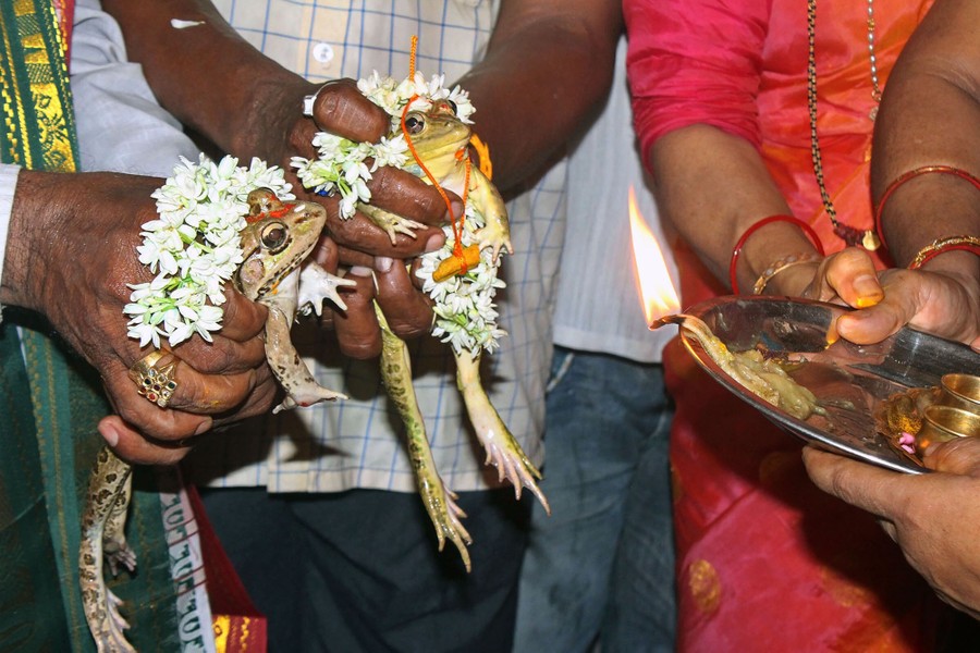 Read moreMembers of the Udupi Zilla Nagarika Samithi conduct a "manduka kalyanotsava," or wedding of frogs, an ancient ritual of marrying a male and a female frog in a ceremony believed to bring rains to the region, in the coastal town of Udupi, India, on June 8, 2019. #