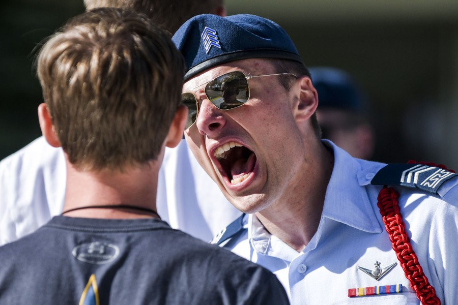 Read moreA member of the United States Air Force Academy cadre yells at a basic cadet as he attempts to stand at attention during the start of basic training for the class of 2023 on June 27, 2019 in Colorado Springs, Colorado. #