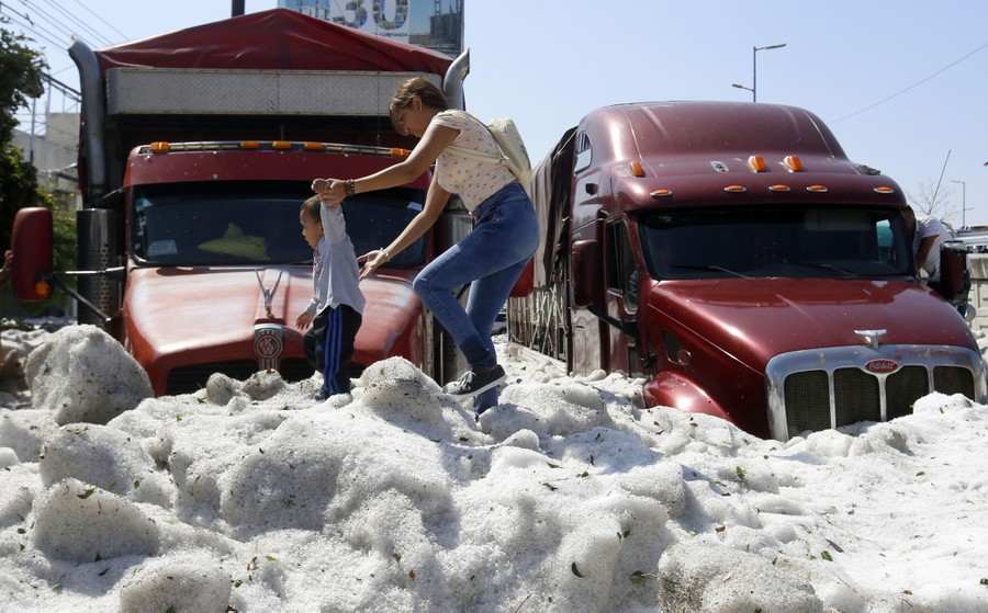 Read moreA woman and a child walk on a huge pile of hail in the eastern area of Guadalajara, Jalisco state, Mexico, on June 30, 2019. The accumulation of hail in the streets of Guadalajara buried vehicles and damaged homes. #