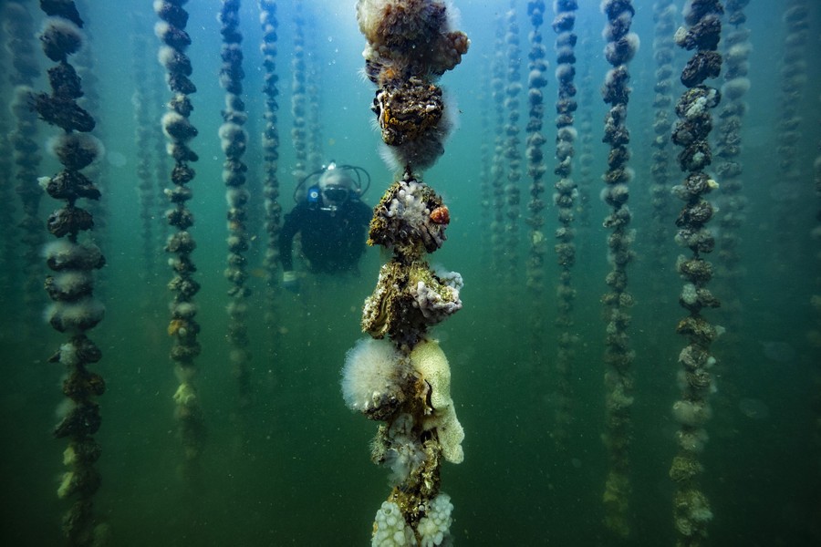 Read moreFrench oyster aquaculturist Jean-Christophe Cabrol checks the growth of oysters covered with sea squirts on collector lines in a shellfish farming pond in Bouzigues, near Montpellier, France #