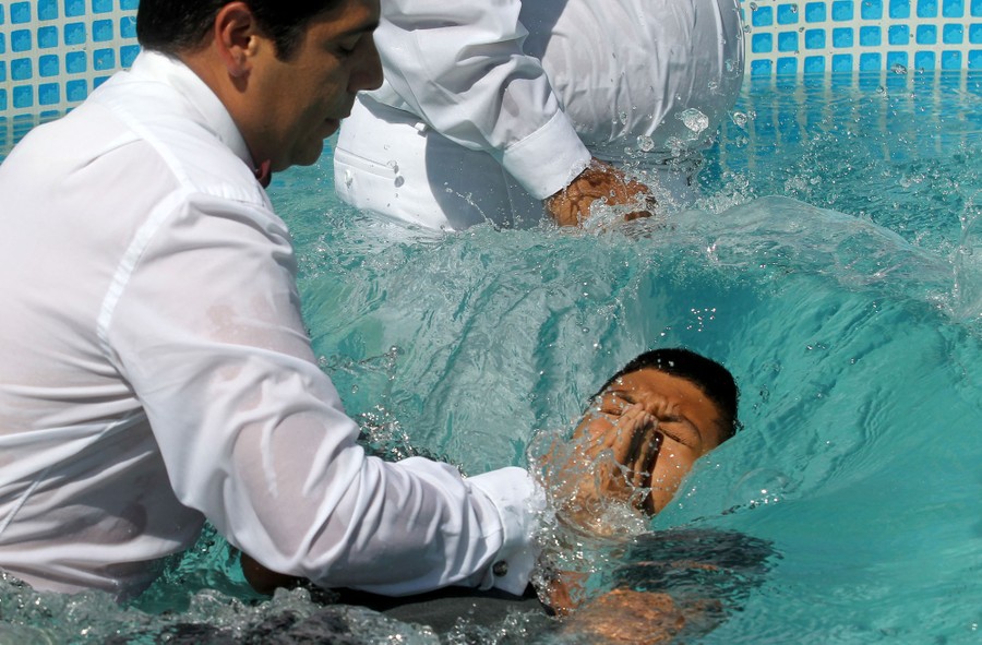 Read moreFollowers of the Mexican-based Pentecostal church Light of the World, participate in a baptism ceremony in Guadalajara, Jalisco state, Mexico, on August 12, 2019. The controversial church celebrated its massive baptism ceremony while its leader Naason Joaquin Garcia—imprisoned in the United States, awaiting trial on several charges, including the rape of minors—says he is accomplishing another "divine mission," preaching among inmates. #