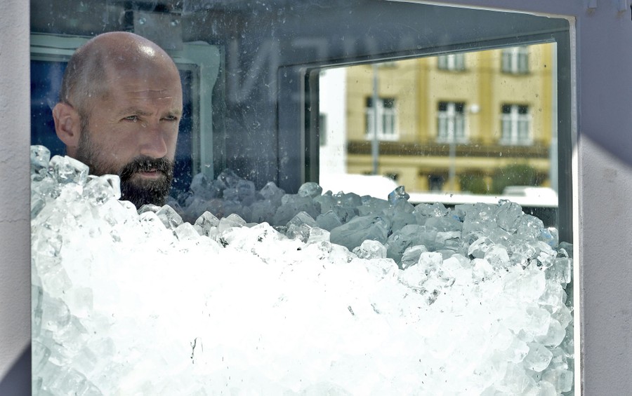Read moreAustrian ice swimmer Josef Koeberl stands in a box filled with ice cubes during his world record attempt of "Longest Duration Full Body Contact With Ice" in Vienna, Austria, on August 10, 2019. #