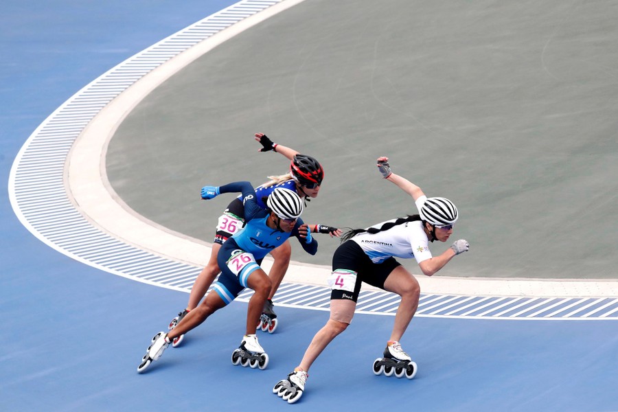 Read moreArgentina's Maria Lopez Rodriguez, Kelsey Helman of the U.S. and Guatemala's Dalia Soberanis Marenco compete in the Roller Speed Skating Women's 500m + Distance Preliminaries during the the Pan American Games at the Costa Verde Skating Ring in Lima, Peru, on August 10, 2019. #