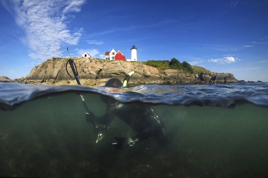 Read moreSpear fisherman Aristotle Captain of Portsmouth, New Hampshire, hunts for tautog while snorkeling off of Nubble Light in York, Maine, on August 14, 2019. Tautog is a species of wrasse fish that lives on the rocky bottom. #