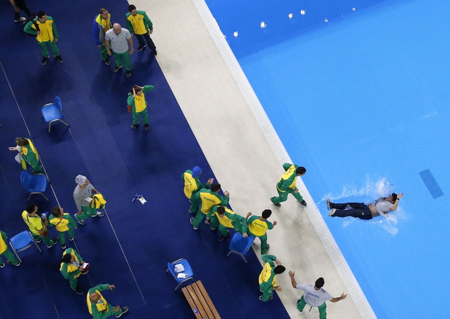 Read moreBrazil's swimmers toss a member of the team into the empty diving pool after the end of the swimming competition at the Pan American Games in Lima, Peru, on August 10, 2019. #