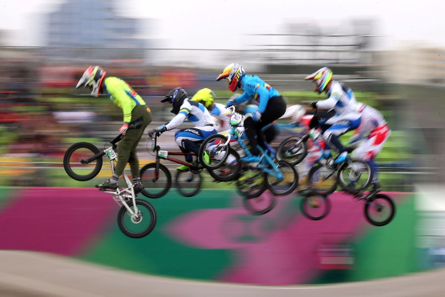 Read moreCompetitors pass by while jumping in the Cycling BMX Men's Semifinal at the Costa Verde Beach Circuit in Lima, Peru, during the Pan American Games on August 9, 2019. #
