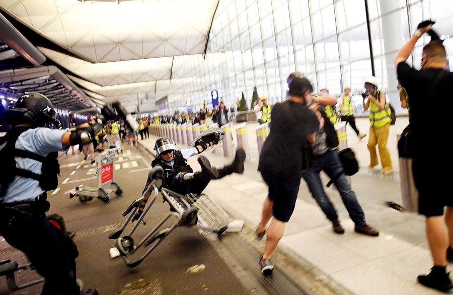 Read moreA policeman falls during a scuffle with pro-democracy protesters at Hong Kong's international airport on August 13, 2019. Hundreds of flights were canceled or suspended at Hong Kong's airport on August 13 as pro-democracy protesters staged a second disruptive sit-in at the sprawling complex, defying warnings from the city's leader who said they were heading down a "path of no return." #