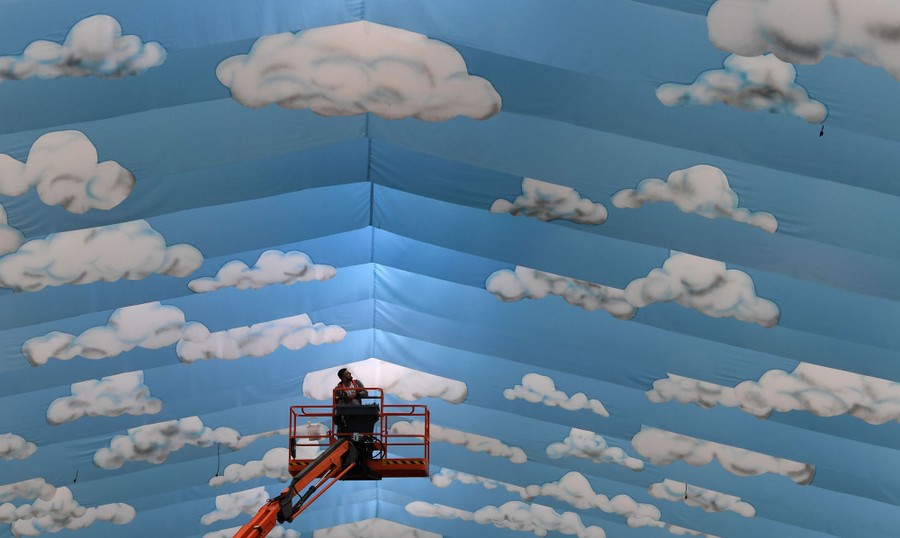 Read moreAn employee stands on a lifting platform as he works in a festival tent for the upcoming Oktoberfest beer festival at the Theresienwiese in Munich, Germany, on August 13, 2019. #