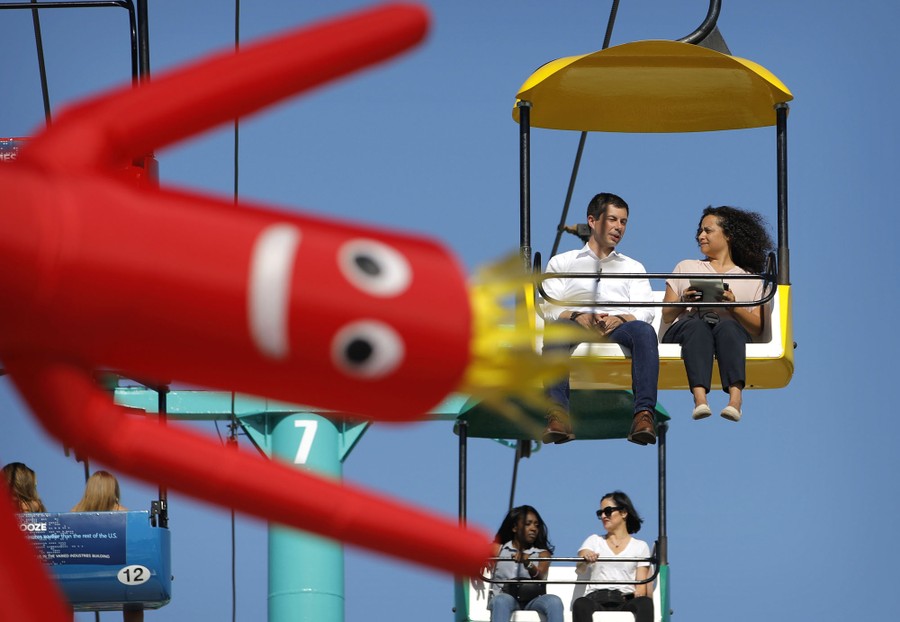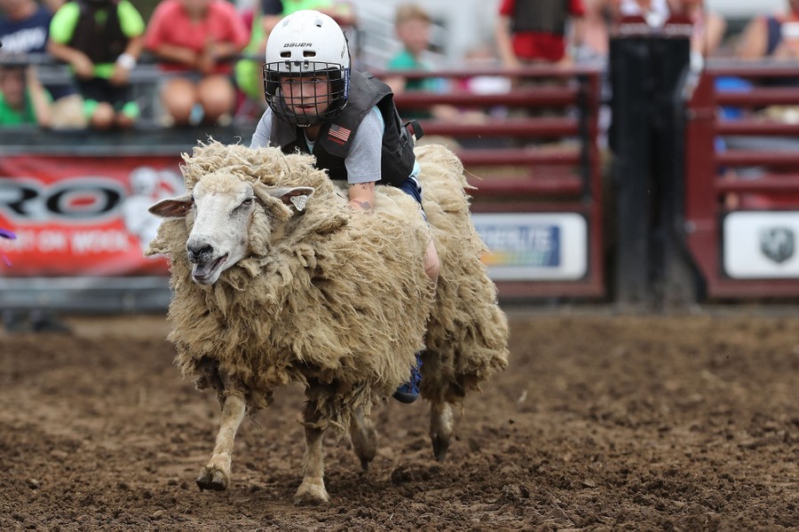 Read moreWearing a helmet and protective vest, a young boy rides a galloping ewe during the Wool Riders Only Mutton Bustin' competition at the Iowa State Fair on August 12, 2019, in Des Moines, Iowa. #