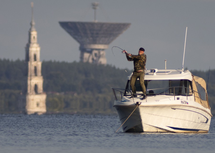 Read moreA man fishes near the famous Kalyazin Bell Tower, part of the submerged monastery of St. Nicholas, and a giant antenna of the Kalyazin radio astronomy observatory, in the town of Kalyazin located on the Volga River, 180 km northeast of Moscow, Russia, on August 11, 2019. #