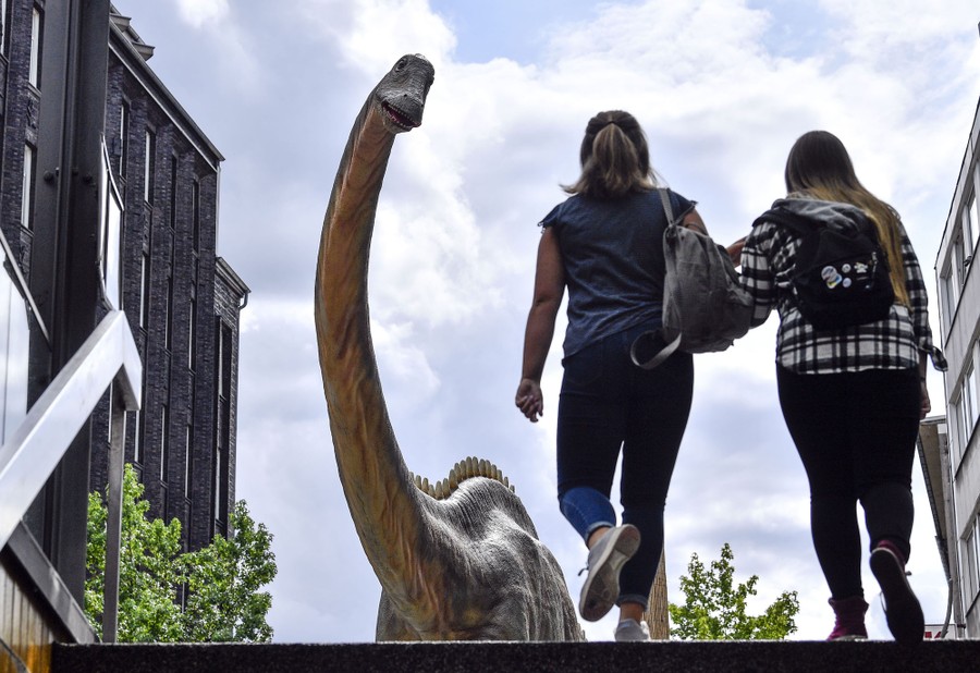 Read moreA life-size replica of a Diplodocus watches people coming out of the subway in the city center of Bochum, Germany, on August 12, 2019. The exhibition, featuring models of 33 dinosaurs all around the city center, is in Bochum due to the discovery of a 316-million-year-old dinosaur track found in a stone pit in the city six years ago. #